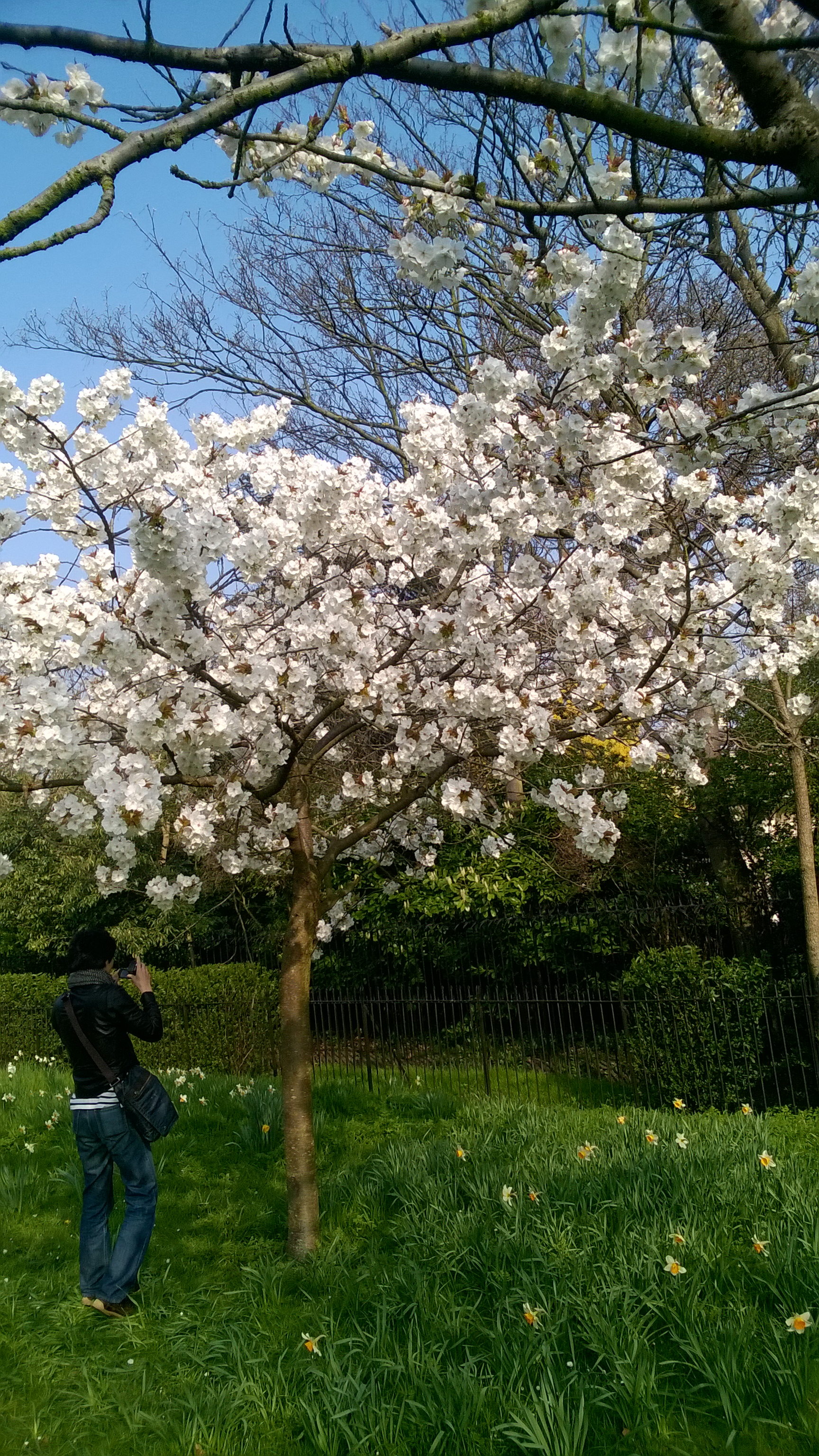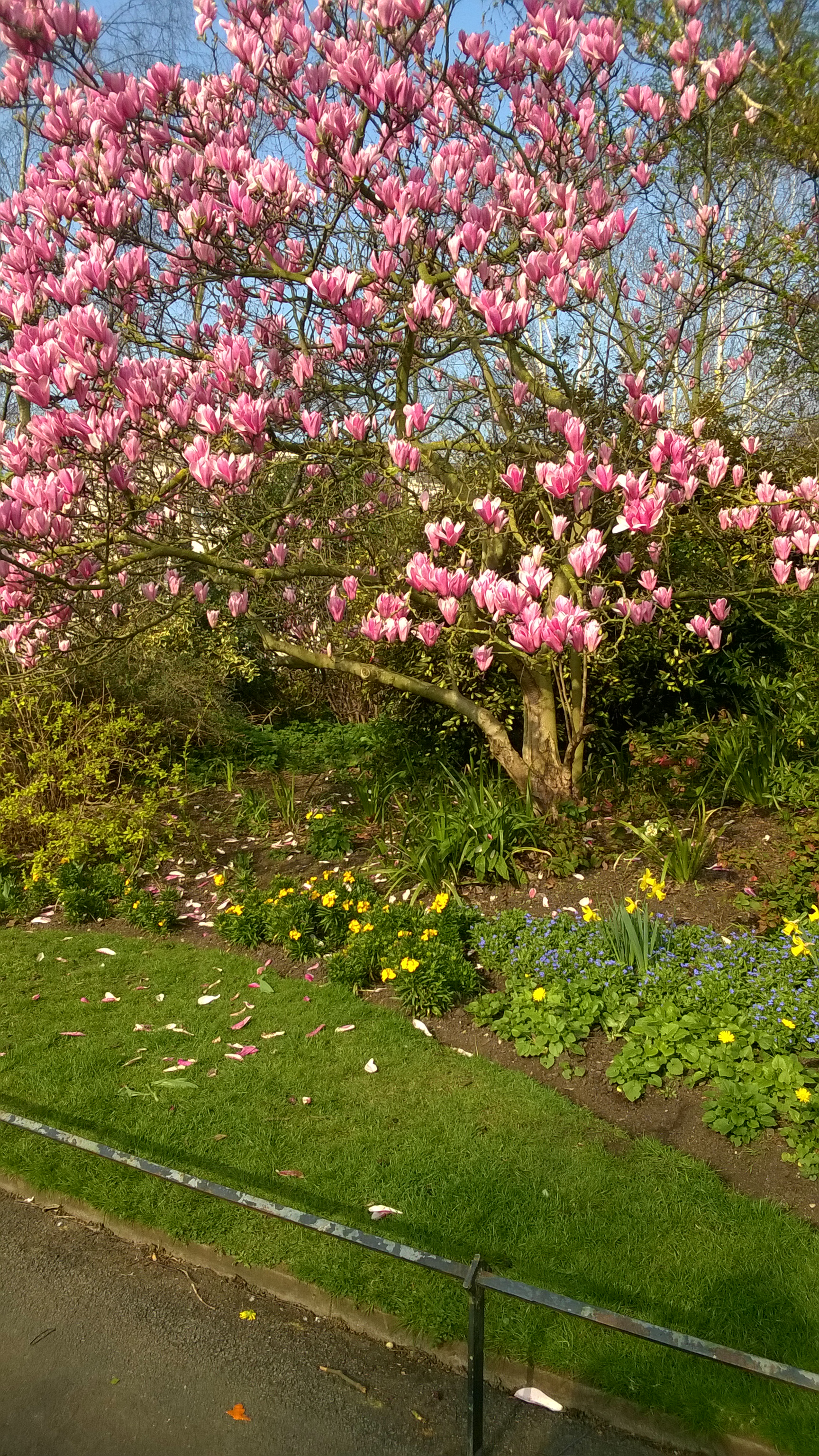 9.4. Upeita kukkivia puita Regent's parkissa. Ruusutarhassa ei vielä ruusuja.