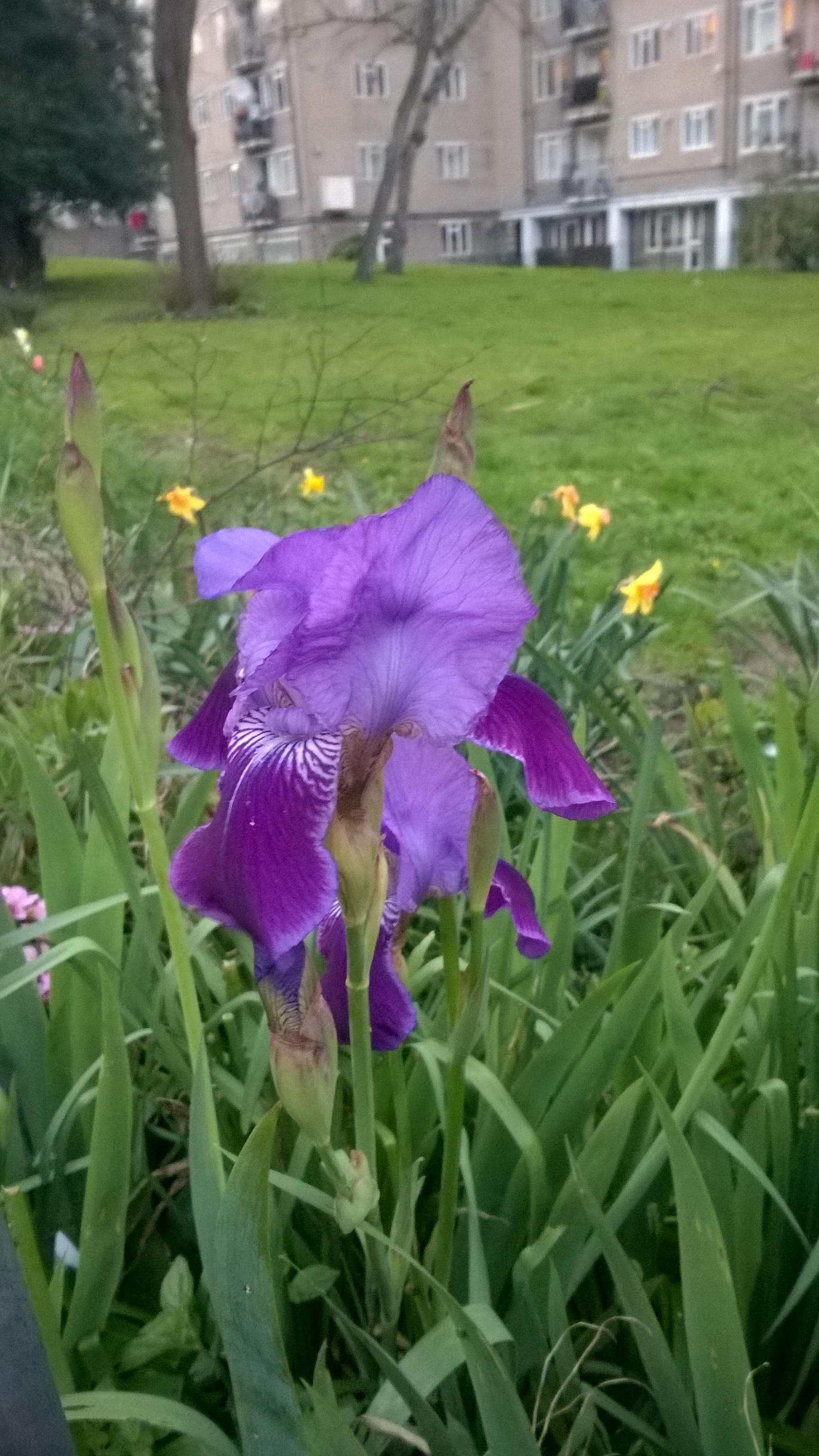 Joka pihalla kukkii valko-keltaisia narsisseja, hyasinttejä ja jonkin verran tulppaanejakin. Yhdellä pihalla bongasin myös kauniita lilanvärisiä kukkia.